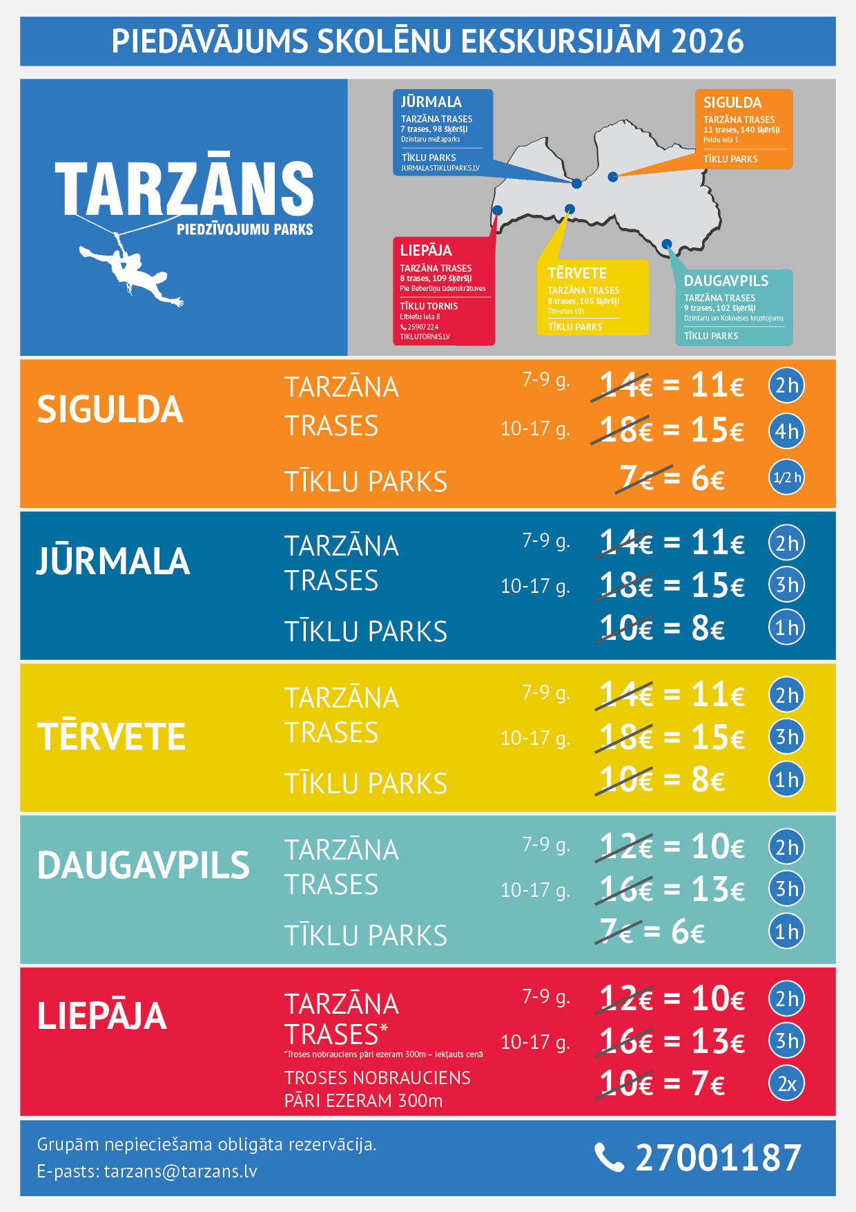 Nepieciešama obligāta rezervācija zvanot uz telefona numuru 27001187 vai rakstot uz e-pastu liepaja@tarzans.lv